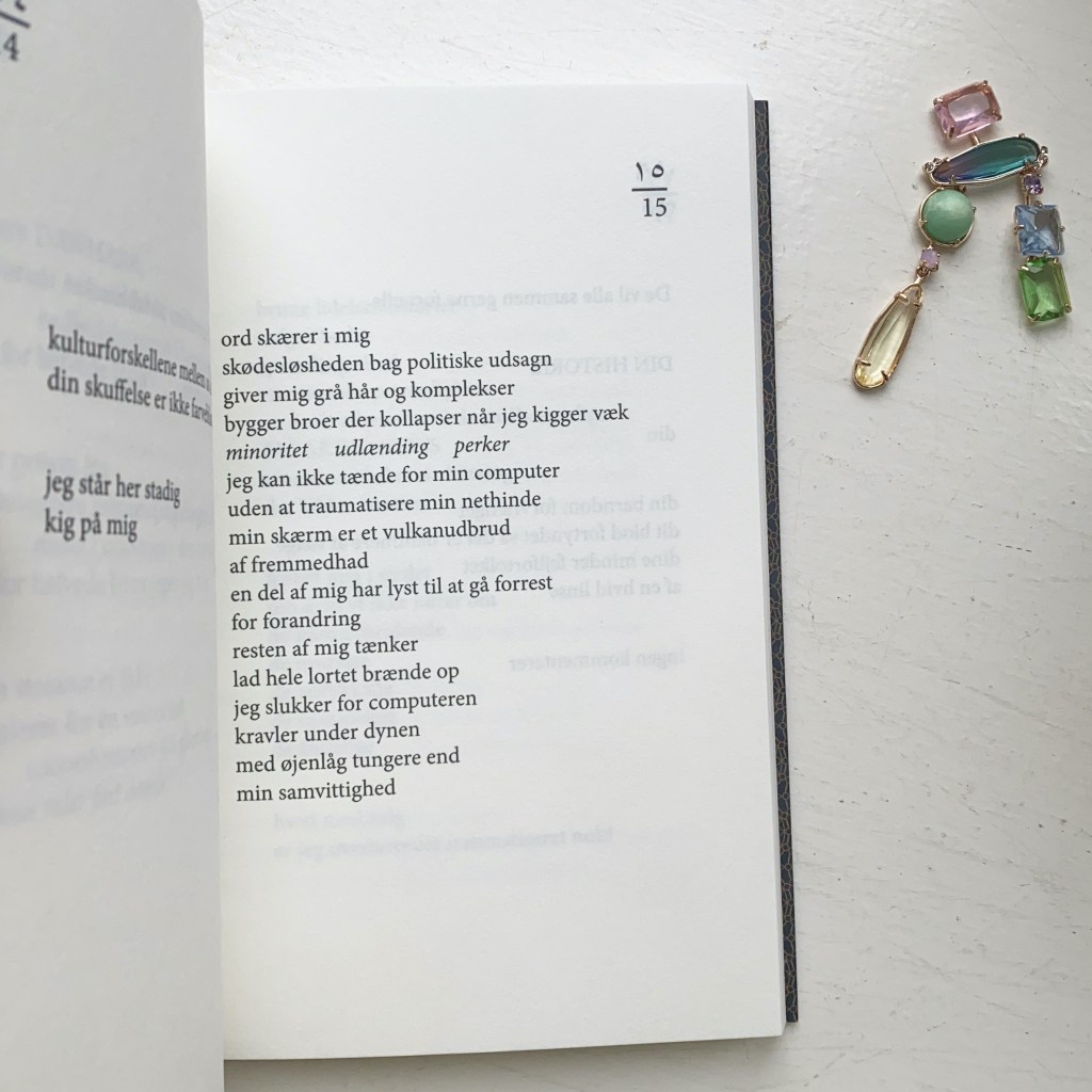Hvis du har læst anmeldelsen og tænkt ‘den lyder egentlig spændende, men den er nok ikke skrevet til mig’, så jo, den er lige præcis også til dig. Læs, lær og forstå et nyt synspunk, og berig dig selv med, at du er du blevet så meget klogere. Digtsamlingen er med til at rejse de vigtige spørgsmål: hvordan er man dansk? I hvor stor grad er “danskhed” forbundet til udseende, i forhold til væremåde? Og er der virkelig kun én måde at være det på? Men den er også en hyldest til dem, der ikke tvinger sig selv til at vælge mellem de ting der udgør dem, og til de der tilhører flere kulturer, flere lande, flere mennesker og forbliver tro mod dem selv, og alle de finesser, der udgør dem.