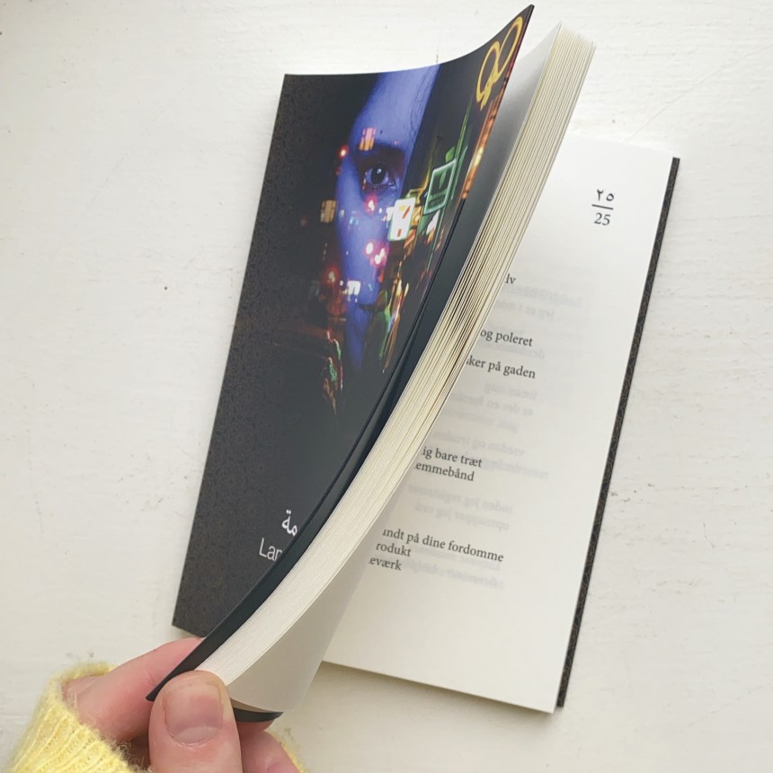 Digtsamlingen har en interessant opsætning. Over hvert sidetal på dansk, er det skrevet på arabisk. Det samme et tilfældet på forsiden, hvor jeg antager at det er Saras navn eller bogens titel, der står skrevet på arabisk. Det er dog ikke alle sider der har sidetal. Tallene nummererer snarere digtene i stedet for sidetallene, og vi kommer op på i alt 66 digte, på bogens 112 sider.