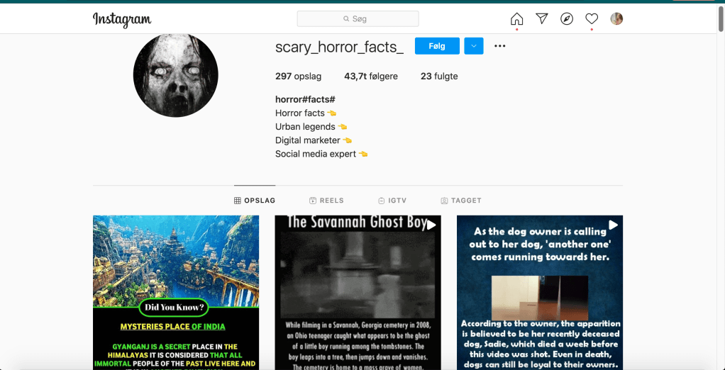 Be aware – det er nogle gange en lidt spøjs IG profil, og der kommer også en gang imellem content, man ikke lige regnede med eller som ikke passer helt ind, men det er ikke så slemt igen. Her kan du dog finde gamle legender, monstre, true crime, paranormale historier og filmclip; alt sammen i én dejlig smøre 🦇