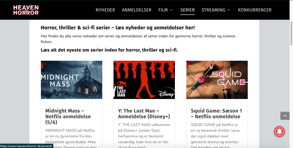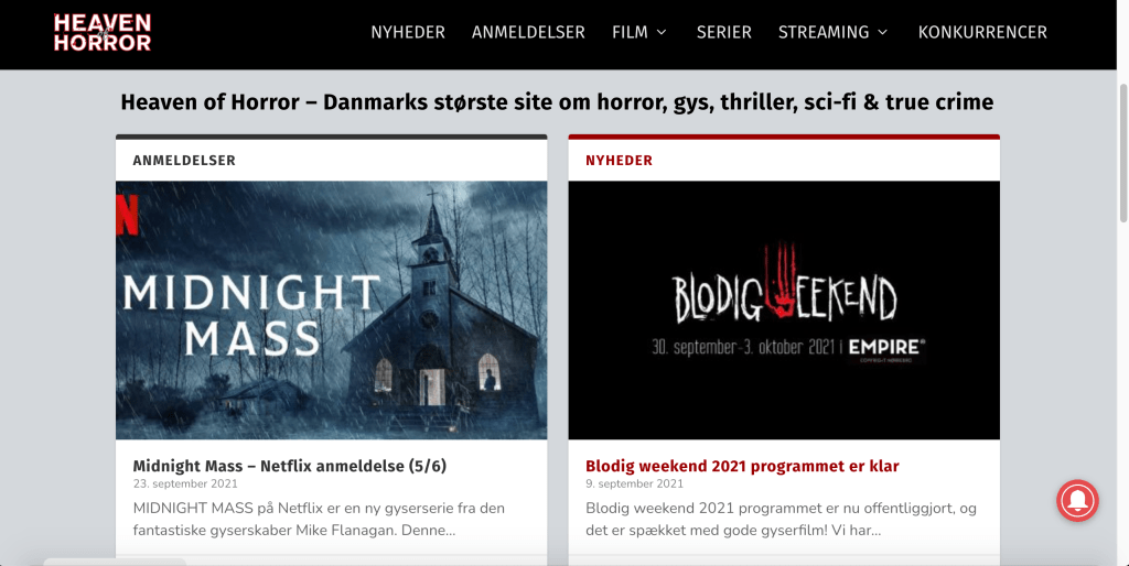 Når alt kommer til alt, er der i virkeligheden kun ét medie jeg ville anbefale alle der elsker gys, true crime, horror og det overnaturlige – heavenofhorror.dk 🧡 Det er her jeg selv holder mig opdateret på alt omkring kommende film, nye udgivelser, streaming, serier, læser anmeldelser og deltager i en masse konkurrencer. Dén hjemmeside er alfa-omega for enhver horror-entusiast ☠️