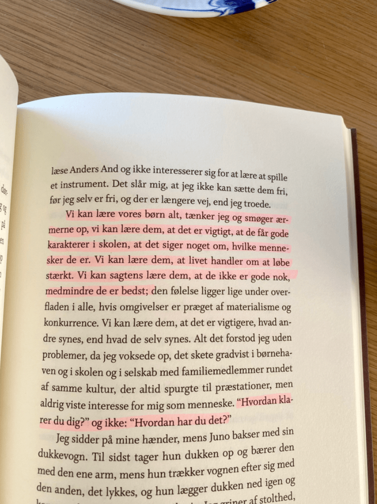 Vi kan lære vores børn alt, tænker jeg og smøger ærmerne op, vi kan lære dem. at det er vigtigt, at de får gode karakterer i skolen, at det siger noget om, hvilke mennesker de er. Vi kan lære dem, at livet handler om at løbe stærkt. Vi kan sagtens lære dem, at de ikke er gode nok, medmindre de er bedst (…) “Hvordan klarer du dig?” og ikke “Hvordan har du det?”