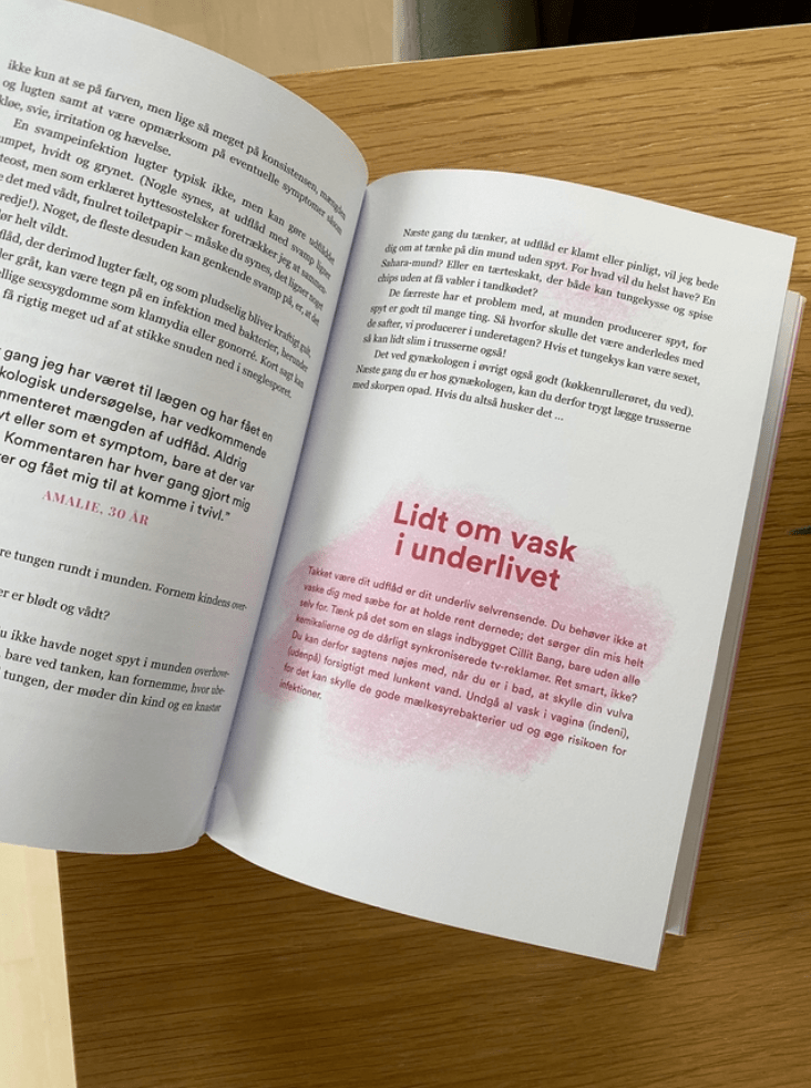 “Dit underliv er med dig overalt. Når du swiper til højre på en cutie på Tinder og får sommerfugle i fissen, når du har menstruationssmerter, når du skal på toilettet, eller når du skal til screening for celleforandringer hos gynækologen … Men det er ikke rigtig noget, vi taler om. Måske fordi underlivet er så godt gemt væk bag blonder og trusseindlæg. Og hvad gør man så, når man føler sig mere liderlig end gennemsnittet? Eller kedelig, fordi man slet ingen lyst har? Hvad sker der lige for, at det nogle gange føles som en fontæne dernede og andre gange som Saharas ørken? Og er man egentlig en dårlig feminist, hvis man faker sine orgasmer? “