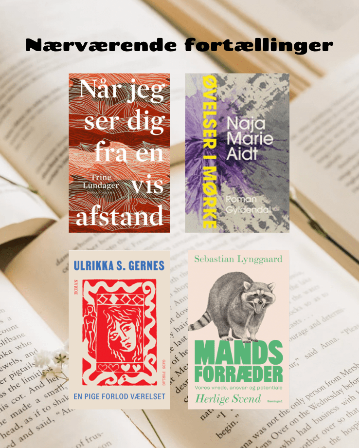 Øvelser i mørke af Naja Marie Aidt. “I en lejlighed i byen bor en 57-årig kvinde. Hendes børn er flyttet hjemmefra, hun bor alene og sover ofte under sofabordet. Hun er ramt af PTSD efter en stærkt traumatisk oplevelse, der trækker andre voldsomme livserfaringer op til overfladen, og hun kommer kun igennem hverdagen med støtte fra sine fire veninder. Hver uge tager hun bussen ud til PTSD-manden, som skal hjælpe hende til at nærme sig det frygtelige, der er sket.” (gyldendal.dk)